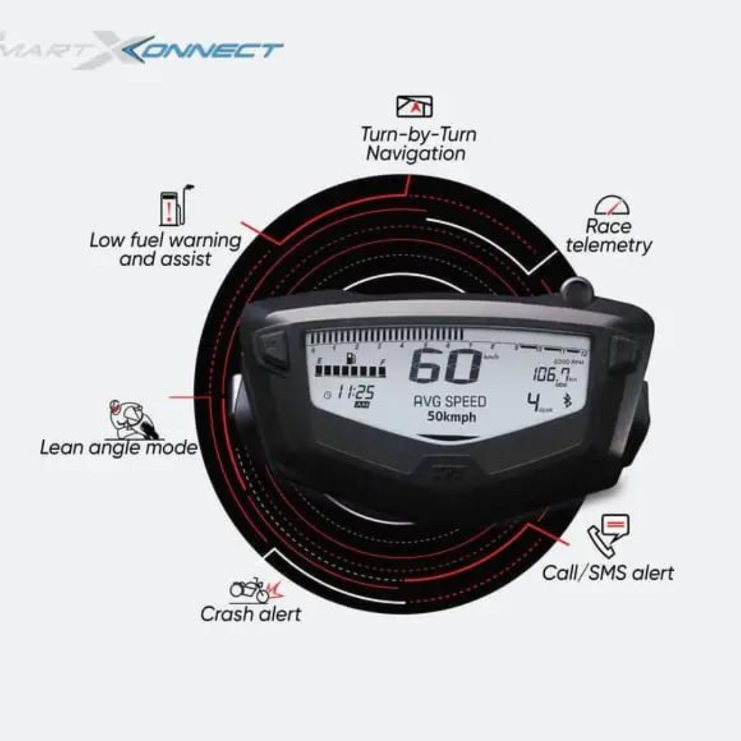 The TVS SmartXonnect app is enabled with Bluetooth connectivity and Voice assist. The navigation system displays directions on the console and the system is pre-programmed with essential stops such as fuel stations, hospitals and restaurants. The fuel warning system, senses when your fuel is low and redirects you to the nearest fuel station. The system also provides specific riding telemetry that the rider can easily analyse. It also features call and SMS alert, so that you don't miss a thing. While the crash alert feature notifies your selected contacts in the event of a crash.